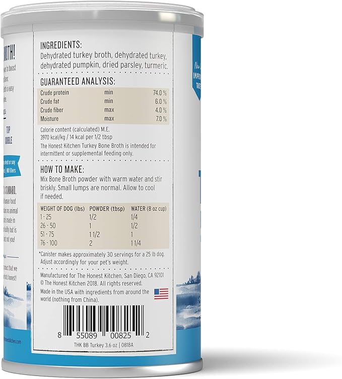 - EXTRA NUTRITION: Add protein and nutrients to your dog's food with The Honest Kitchen's beef bone broth enriched with superfoods like pumpkin and turmeric. Serve it as flavorful broth to soften dry food or try freezing it in an enrichment toy or treat.