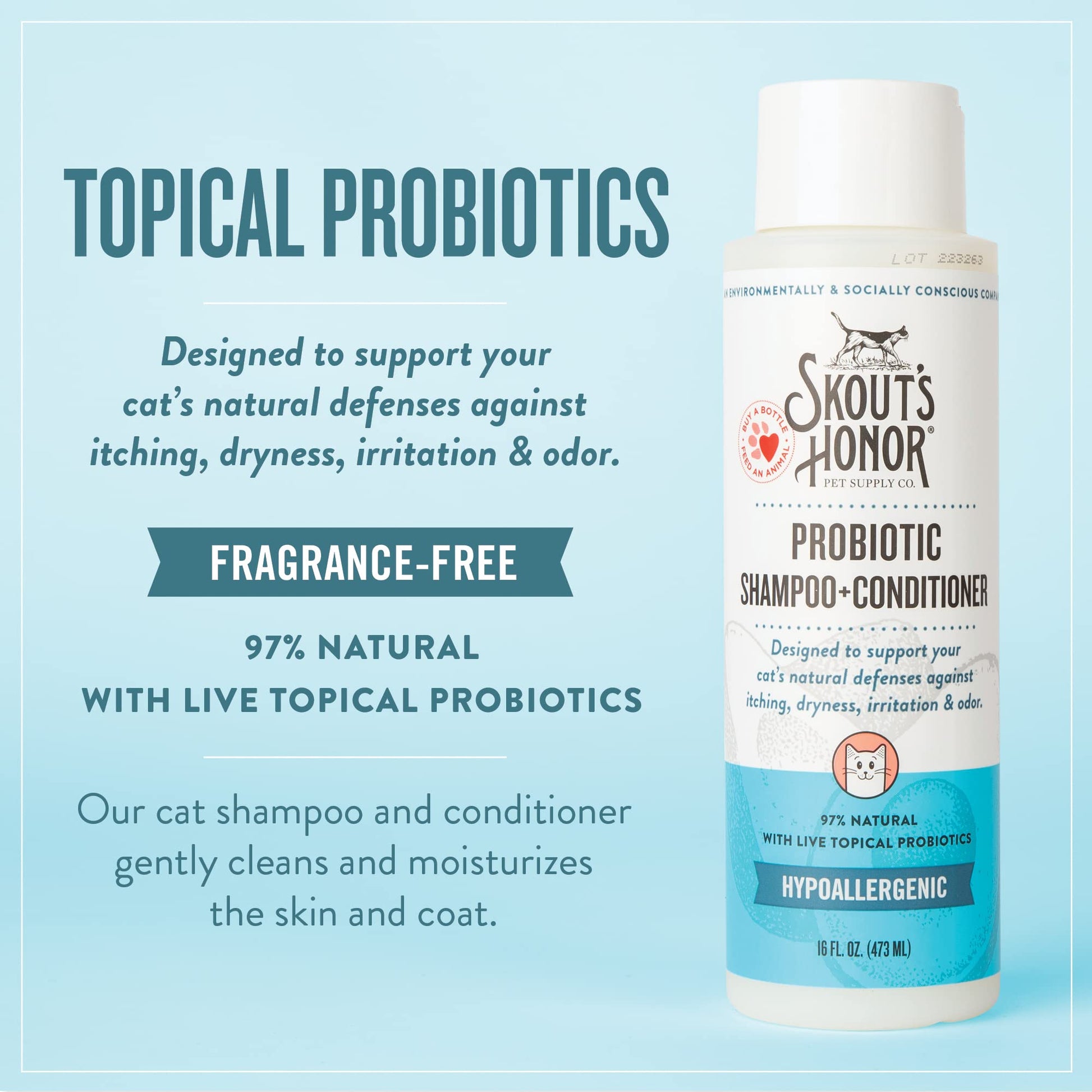 Skout's Honor Probiotic Cat Shampoo & Conditioner with Avocado Oil & Omega-3s, 97% Natural, Paraben & Sulfate-Free, Cruelty-Free, 16oz, Fragrance Free