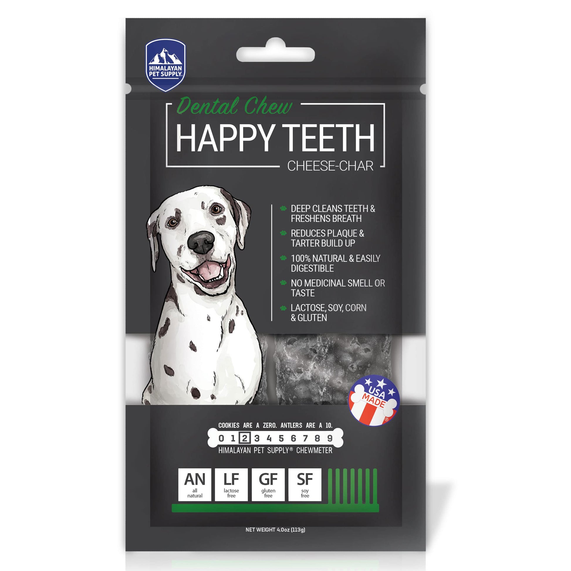 PROUDLY MADE in the USAHimalayan Pet Supply Cheese-Char Dental Chew is a distinctive blend of cheese and activated charcoal, supporting your dog’s overall dental health. This long-lasting chew provides your pup with all the dental benefits your dog needs. The natural chewing process removes plaque and tartar buildup and the activated charcoal adds extra cleaning power, freshens breath, and whitens teeth. Cheese-Char is made with the same Himalayan recipe providing your pup with savory cheesy goodness, with no medicinal smell or taste. These dental chews are all-natural, lactose, grain, soy, corn, and gluten free, with no preservatives or binding agents.Feed 2 hours before or after any meal.• Provides extra dental cleaning power, whitens teeth, and freshens breath• Reduces tartar and plaque build up• Long-lasting, 100% natural, and easily digestible• No medicinal smell or taste• Lactose, grain, soy, corn, grain, and gluten free
