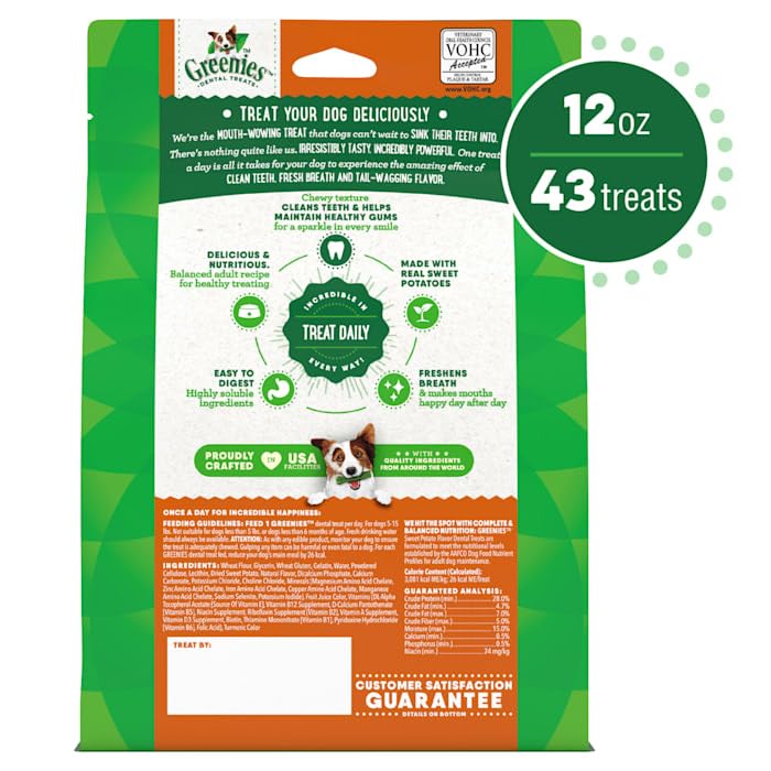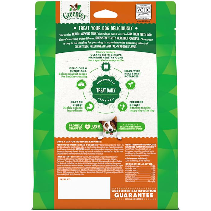 GREENIES TEENIE Natural Dental Dog Treats are irresistible daily dental chews that your canine companion will love and are made for small breed dogs between 5 and 15 pounds. These delicious dog treats are made with real sweet potato and natural ingredients, plus vitamins, minerals and nutrients. Thanks to the unique, chewy texture, these canine treats clean right down to the gum line to help fight plaque and tartar and freshen your dog's breath.