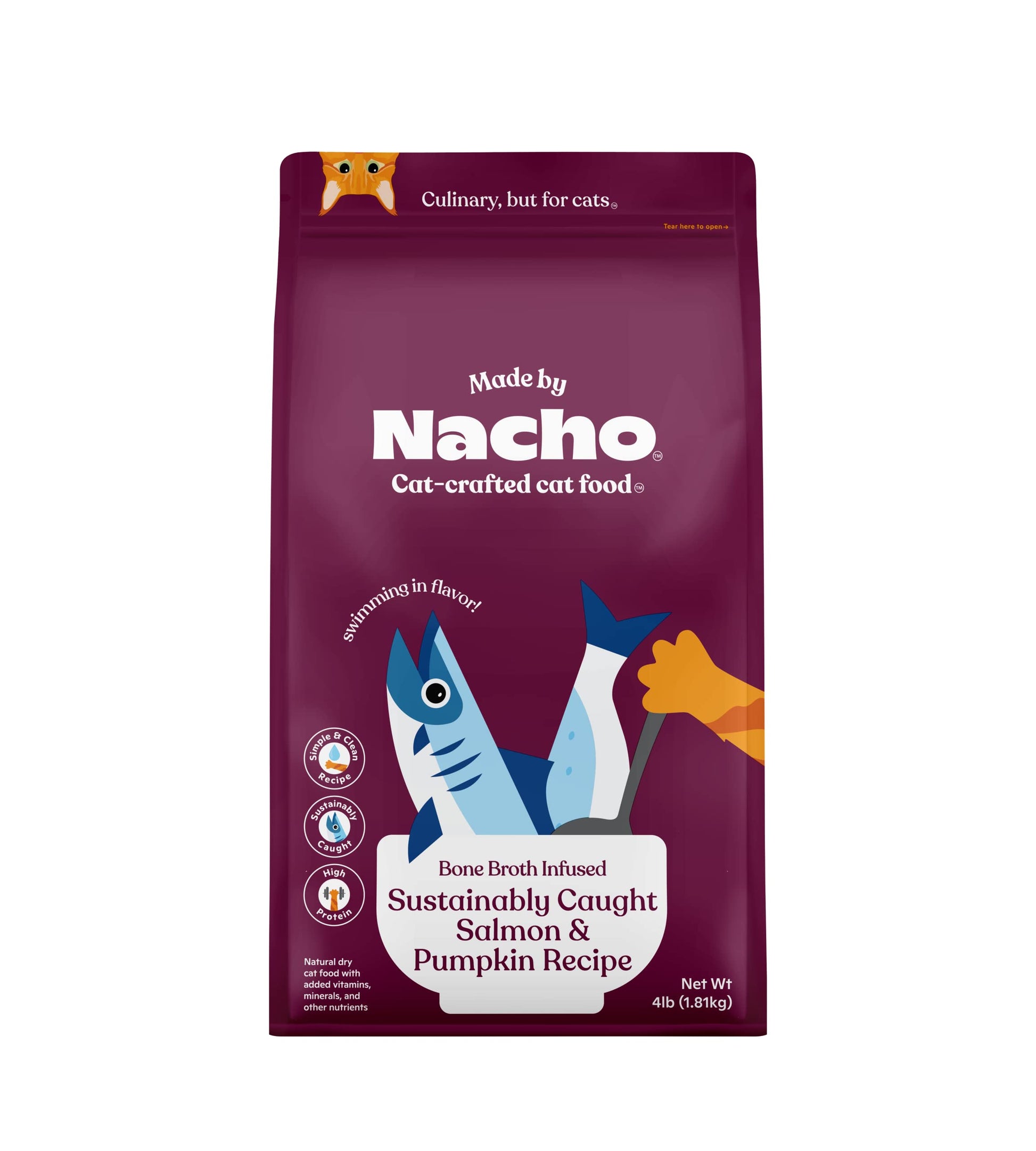 Made by Nacho Bone Broth Infused Dry Cat Kibble - Sustainably Caught Salmon and Pumpkin - Premium Grain-Friendly Cat Food 4lb Bag, Limited Ingredients