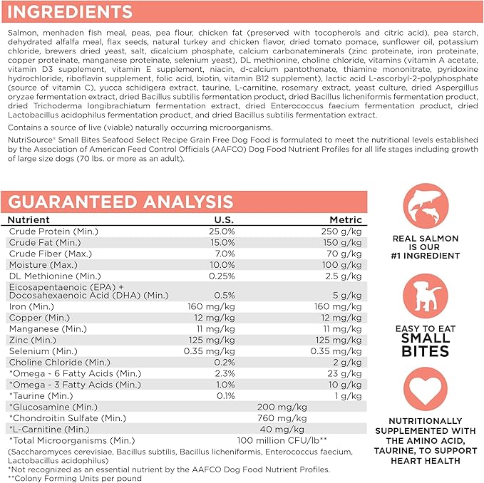 - As a member of our grain free series of dog foods, NutriSource Grain Free Seafood Select Recipe Dog Food is formulated to meet AAFCO guidelines for all life stages