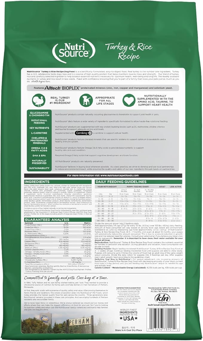 NutriSource Dog Food Turkey & Rice Formula provides super premium nutrition in a scientifically formulated easy-to-digest food. Real turkey is the number one ingredient. Turkey is a source of high quality protein to help maintain muscle mass and strength
